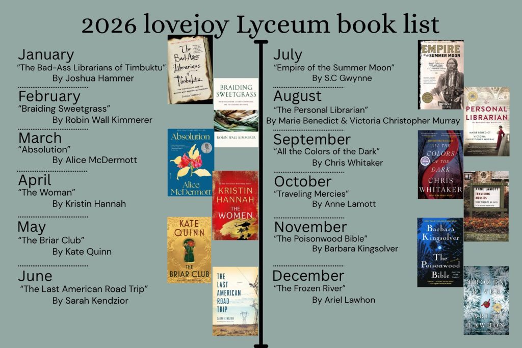The LoveJoy Lyceum is our book club that began during the Pandemic. We read a variety of fiction and non-fiction works and discuss them via Zoom on the third Wednesday of each month at 7:15 PM.